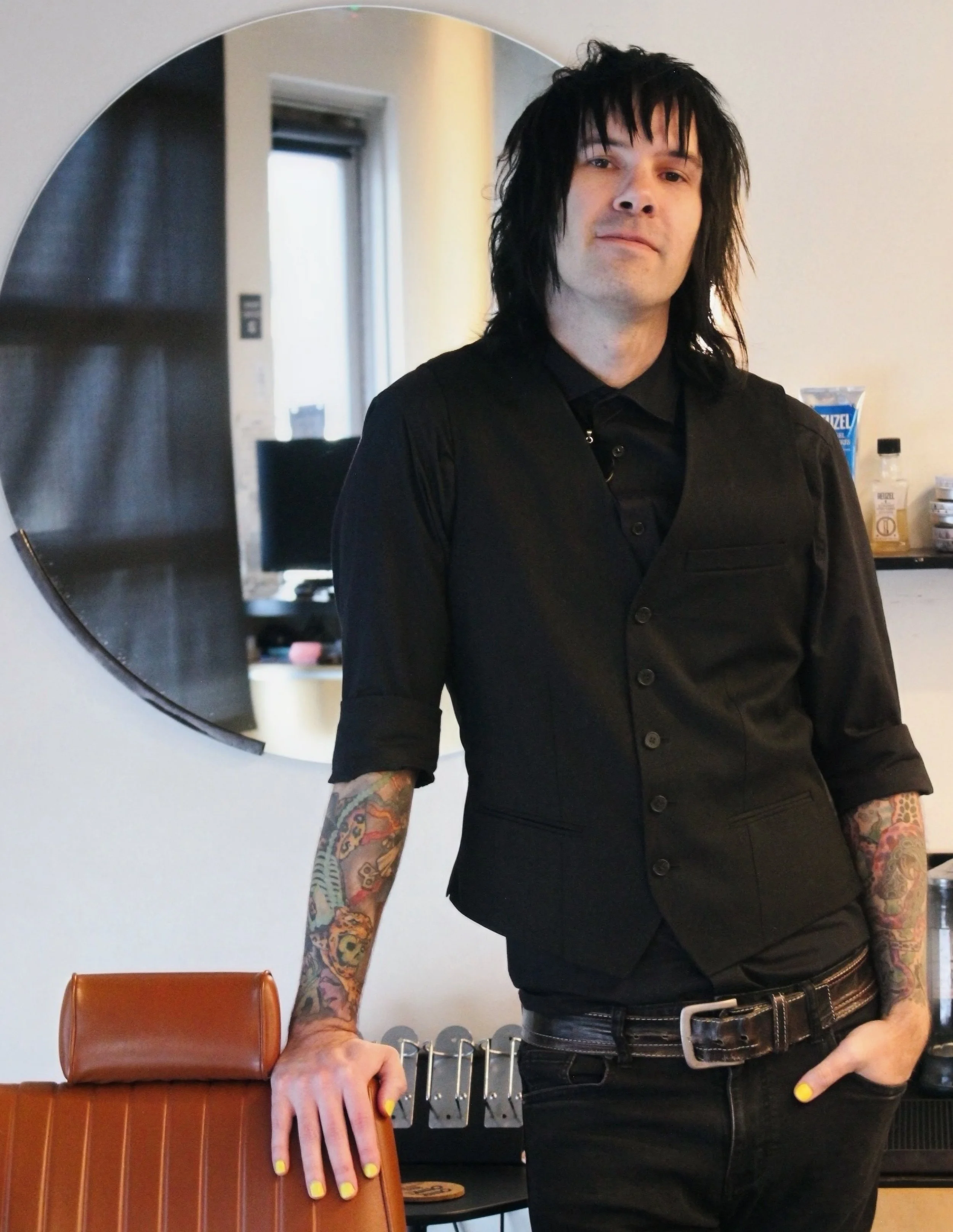 When he’s not behind the chair, Ian stays rooted in Denver’s creative scene. You’ll likely find him at a local music venue—either performing on stage or supporting from the crowd. If he isn’t surrounded by art and music, he’s likely out hiking a trail or at home recharging with his cat and a classic horror movie.